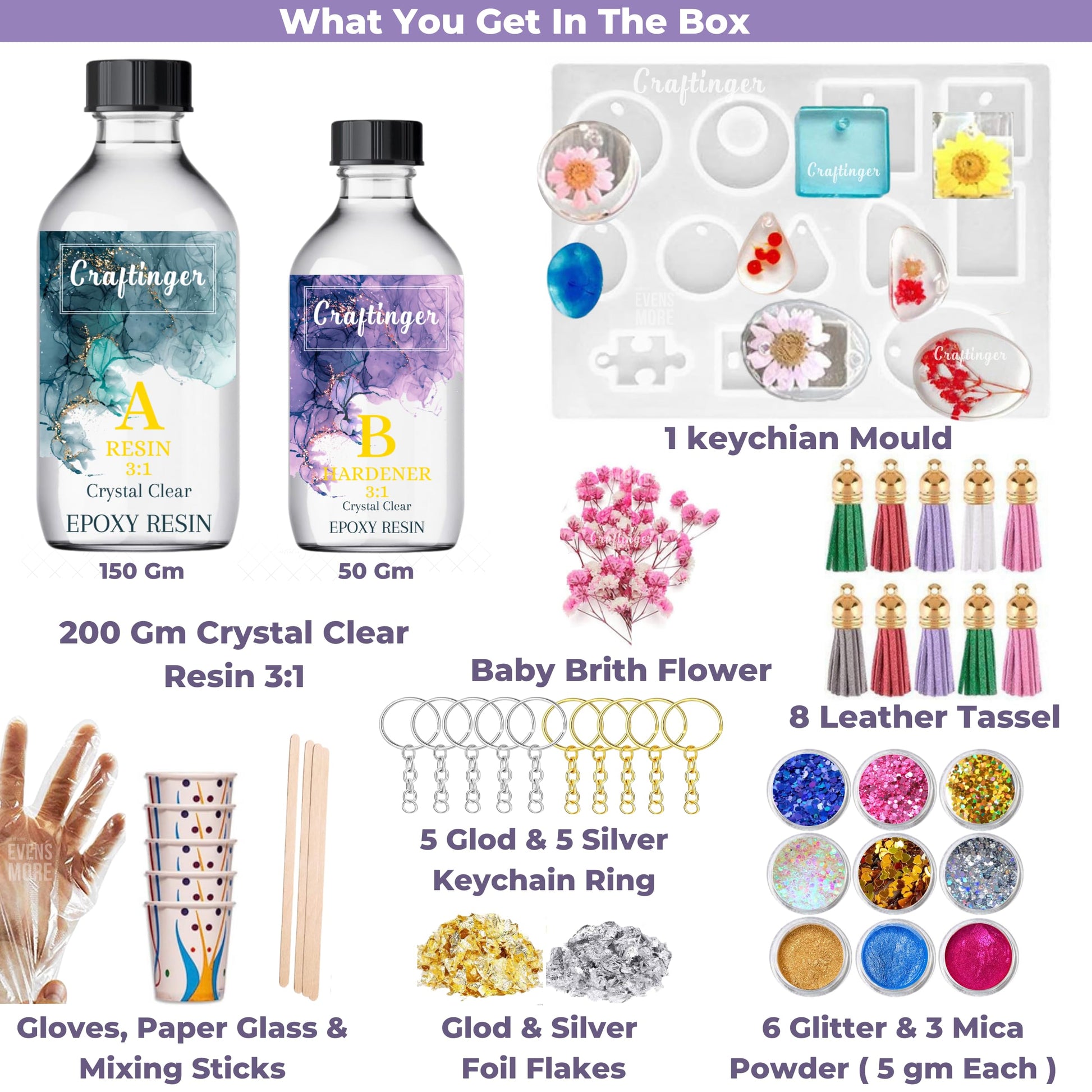 Create your own unique keychains with our Resin Keychain Making Kit. The kit includes a 12 Cavity keychain mould, 200g of crystal clear resin, 6 color pigments, 3 color mica powders, 2 Opaqe Pigments and gold and silver foil flakes, allowing you to make stunning, personalized key chains that reflect your style and personality. Whether you're a beginner or an experienced crafter, our easy-to-use kit is perfect for creating one-of-a-kind keychains that you'll love to use or give as gifts. As a bonus, With our Resin Keychain Making Kit, the possibilities are endless. Make your own unique keychains today!