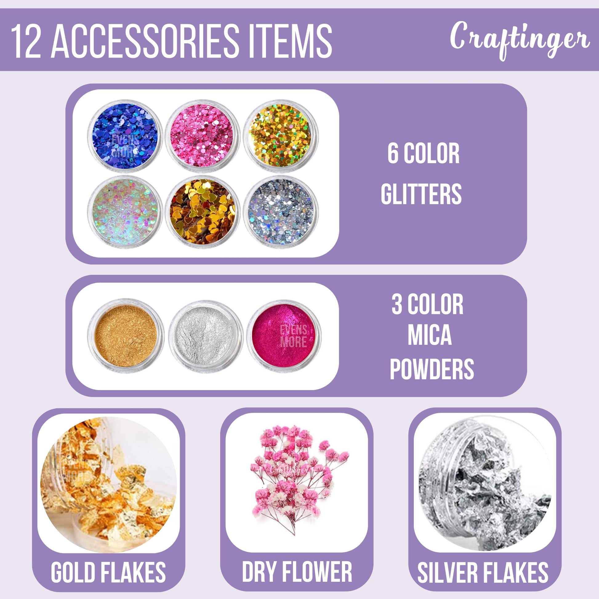- 6 color Glitter, 3 Mica Powder, 2 Opaqe Pigments for creating vibrant designs